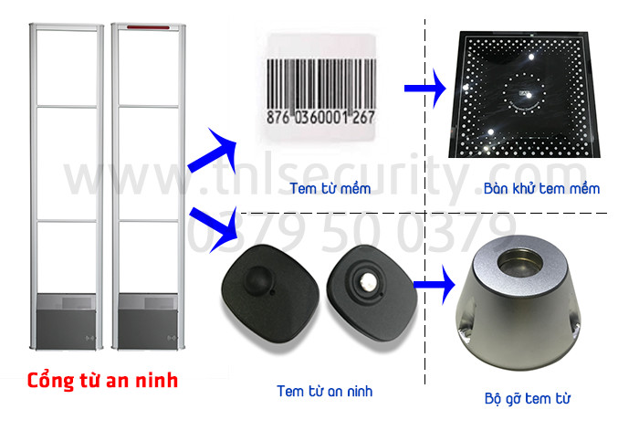 Hệ thống điện từ bao gồm các thiết bị như sau: Cánh cổng từ an ninh chống trộm + thiết bị từ hóa và khử từ tính + tem từ cứng và tem từ mềm