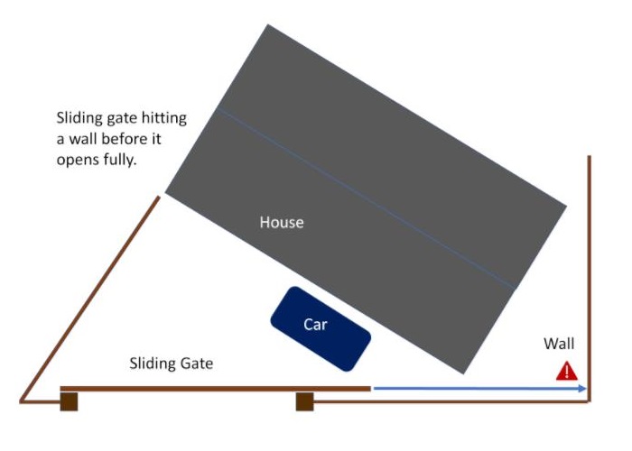 Mỗi cổng xoay đi qua một vòng cung bên trong lối vào cổng. Điều này chứng tỏ họ đi qua phải không có bất kỳ chướng ngại vật nào. Không thể đậu ô tô trong khu vực này và sự hiện diện của các chướng ngại vật bất động như ngôi nhà, bồn hoa, lán, tường hoặc hàng rào ngăn cản việc lắp đặt cổng xoay. Tương tự, nếu đường lái xe lên bên trong cổng, một lúc nào đó cổng xoay sẽ chạm đất. Có những bản lề có thể mở cổng xoay ở một góc để chứa các ổ đĩa tăng lên nhưng những bản lề này lại gây thêm căng thẳng cho động cơ. Ngoài ra, việc gắn các cánh cổng trên bản lề truyền thống để chúng không va vào khu vực xung quanh đòi hỏi một khoảng trống lớn bên dưới cánh cổng đã đóng.