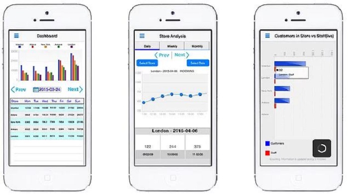 Ứng dụng iOS & Android của máy đếm người 3D cũng có ứng dụng rất riêng có sẵn trên iOS và Android. Điều này có nghĩa là khách hàng cho dù họ là trung tâm mua sắm lớn hay nhà bán lẻ 1 cửa hàng, sẽ có thể theo dõi các báo cáo trên Cloud từ điện thoại thông minh của họ một cách dễ dàng. Trên thực tế, có vẻ như ứng dụng thiết bị thông minh có tính năng mới đầu tiên là hiển thị dữ liệu thời gian thực về số lượng người trong một địa điểm. Vì vậy, nó có thể tính toán khách truy cập vào và ra, và sau đó cho bạn biết có bao nhiêu người trong trung tâm mua sắm của bạn trong thời gian thực. Điều này đã là một yếu tố kéo đối với nhiều người.