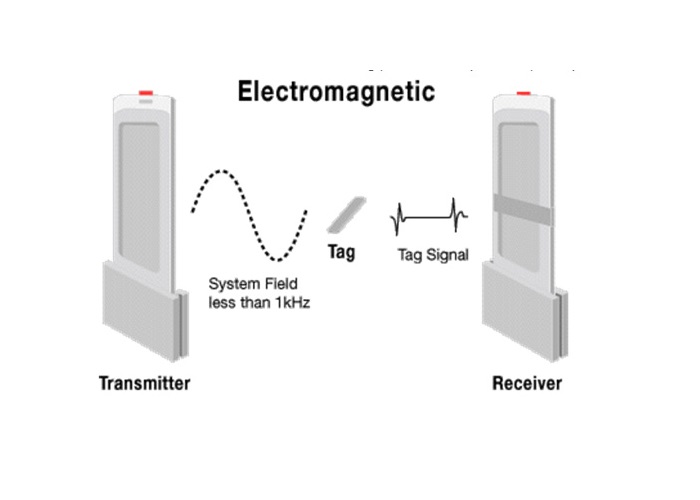 2. Công nghệ EM:Cổng từ an ninh điện từ lý tưởng cho thư viện, hiệu thuốc và cửa hàng mỹ phẩm cũng như các siêu thị, cửa hàng phần cứng và cửa hàng đồ điện. Các tem từ cho các hệ thống này được làm bằng một dải kim loại vô định hình. Kim loại vô định hình là một vật liệu kim loại có cấu trúc theo quy mô nguyên tử bị rối loạn. Trái ngược với hầu hết các kim loại, là những tinh thể và do đó có sự sắp xếp có trật tự cao của các nguyên tử, các hợp kim vô định hình là phi tinh thể (metglas) có giá trị bão hòa từ rất thấp. Ngoại trừ các thẻ vĩnh viễn, dải này cũng được lót bằng một dải sắt từ. Sắt từ là cơ chế cơ bản mà một số vật liệu nhất định hình thành nam châm vĩnh cửu hoặc thể hiện tương tác mạnh với nam châm. Nó là nguyên nhân của hầu hết các hiện tượng từ tính gặp phải trong cuộc sống hàng ngày. Việc phát hiện thẻ được thực hiện với một máy phát và máy thu. Máy phát và máy thu hoạt động cùng nhau để cảm nhận sóng hài và tổng hoặc chênh lệch tín hiệu được tạo ra bởi phản ứng từ trường phi tuyến tính của vật liệu trong một hỗn hợp của từ trường tần số thấp (trong khoảng 10 Hz đến 1000 Hz).