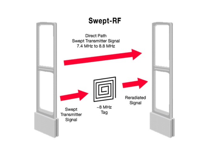 3. Hệ thống cổng từ tần số vô tuyến:Cổng từ an ninh tần số vô tuyến đã được sử dụng trong nhiều năm để chống lại nạn trộm cắp. Một giải pháp hoàn hảo cho các nhà bán lẻ quần áo, cửa hàng bách hóa và siêu thị có sẵn anten với chức năng đếm người. Việc lựa chọn các cổng từ RF được thiết kế hấp dẫn là rất rộng. Một mạch LC là một mạch cộng hưởng hoặc mạch điều chỉnh bao gồm một cuộn cảm, được biểu thị bằng chữ L và một tụ điện, được biểu thị bằng chữ C có cộng hưởng. Trong vật lý, cộng hưởng là xu hướng của một hệ dao động ở biên độ lớn hơn ở một số tần số hơn những tần số khác, chúng được gọi là tần số cộng hưởng của hệ thống. Ở những tần số này, ngay cả những lực truyền động tuần hoàn nhỏ cũng có thể tạo ra dao động biên độ lớn, bởi vì đỉnh của hệ thống ở bất kỳ đâu từ 1,75 MHz đến 9,5 MHz. Tần số phổ biến nhất là 8,2 MHz. Cảm biến đạt được bằng cách quét xung quanh tần số cộng hưởng và phát hiện sự sụt giảm. Việc hủy kích hoạt các tem từ 8.2 MHz đạt được bằng cách ngắt mạch bằng cách phá hủy một phần tụ điện. Tụ điện hay tụ điện là một thành phần điện tử thụ động bao gồm một cặp dây dẫn được ngăn cách bởi chất điện môi. Khi một hiệu điện thế giữa các vật dẫn tồn tại, một điện trường trong chất điện môi. Trường này lưu trữ năng lượng và tạo ra một lực cơ học. Điều này được thực hiện bằng cách gửi tem từ đến một điện từ mạnh.
