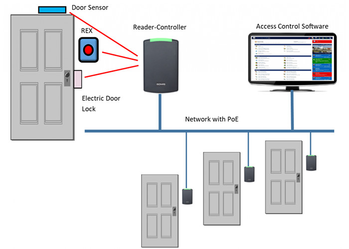 Như một đánh giá, lợi thế của hệ thống kiểm soát ra vào cửa IP là mọi thứ đều được đặt ở cửa. Sơ đồ sau đây cho thấy một ví dụ về hệ thống kiểm soát truy cập IP sử dụng bộ điều khiển đầu đọc.