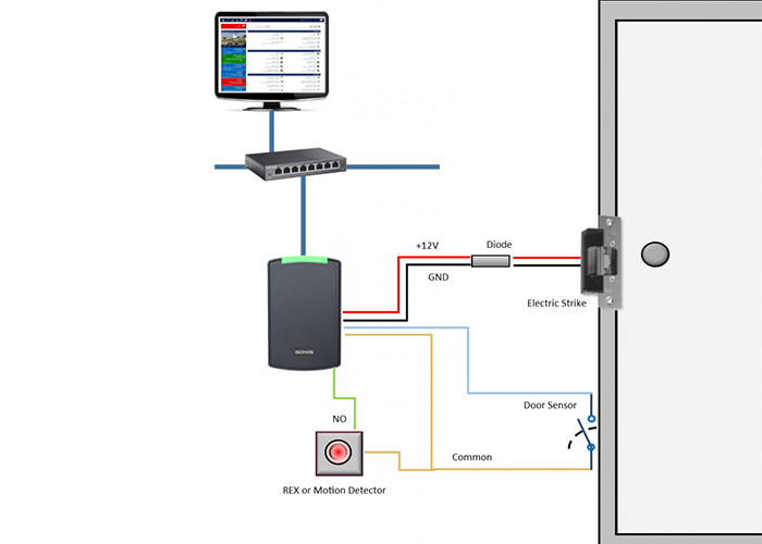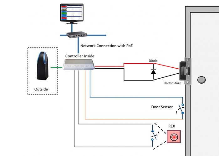 Sơ đồ sau đây cho thấy một ví dụ sử dụng điều khiển đầu đọc IP khi lắp đặt trong nhà. Bộ điều khiển đầu đọc được kết nối với một bộ chuyển mạch mạng bao gồm PoE. Bộ phận ở mặt sau của bộ điều khiển đầu đọc cung cấp tất cả các kết nối với đòn đánh, máy dò chuyển động, cảm biến mở cửa và bất kỳ thiết bị nào khác được yêu cầu ở cửa.
