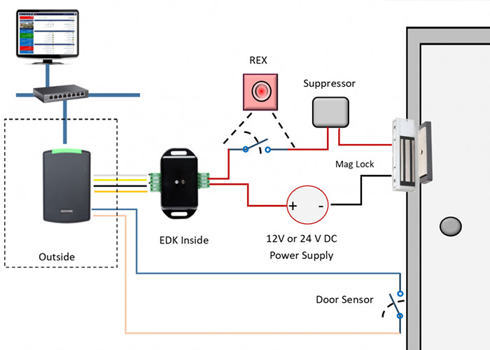 Khi bộ điều khiển hệ thống kiểm soát ra vào cửa bằng đầu đọc được lắp đặt bên ngoài, Bộ cửa ngoài (EDK) sẽ được thêm vào để cung cấp thêm tính bảo mật. Trong cấu hình này, bộ điều khiển đầu đọc sẽ gửi một thông điệp được mã hóa đến EDK đặt trong nhà. Điều này ngăn chặn kẻ phá hoại làm chập dây và mở khóa cửa từ bên ngoài. EDK cũng chứa một rơ le có thể cung cấp năng lượng theo yêu cầu của khóa từ. Khóa từ tính cần nhiều điện hơn so với khóa điện.