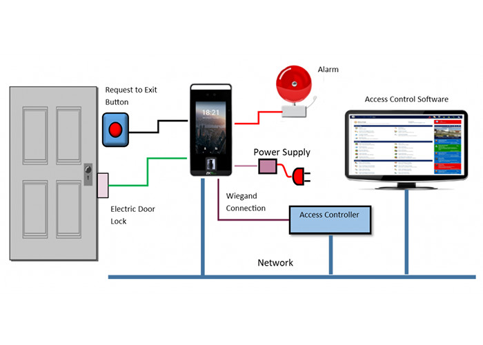 Một số bộ điều khiển trình đọc sinh trắc học bao gồm giao diện mạng cho phép bạn gắn thiết bị với bộ điều khiển ra vào cửa tiêu chuẩn. Hầu hết các bộ điều khiển đầu đọc sinh trắc học yêu cầu nguồn điện riêng thay vì sử dụng PoE. Sơ đồ sau đây cho thấy bảng điều khiển nhận dạng khuôn mặt được kết nối như thế nào.