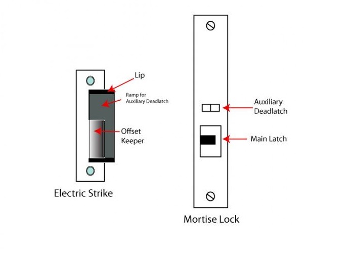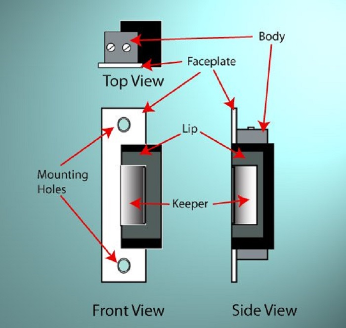 Để lắp đặt một khóa điện tử để giải phóng khóa hình trụ trong cửa và khung kim loại rỗng sẽ cần phải sâu ít nhất 1/2 inch để phù hợp với khóa chết 5/8 inch tiêu chuẩn, với khoảng cách 1/8 inch tiêu chuẩn giữa khung và cửa.