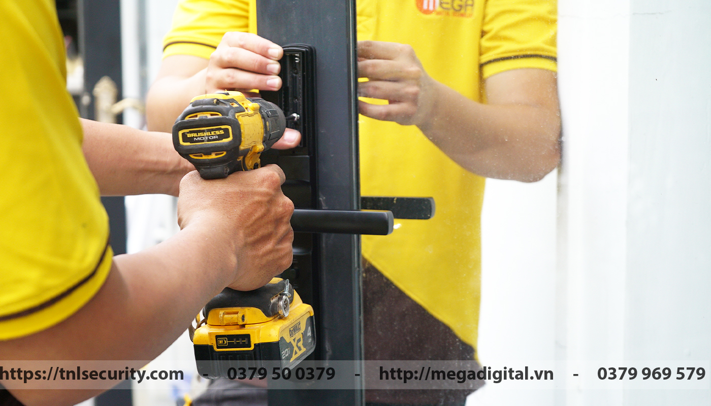 Tiếp theo, kỹ thuật viên phối hợp lắp mặt ngoài của khóa, một người lắp và một người cân chỉnh. Mặt ngoài của khóa có những thành phần như cảm ứng vân tay, cảm ứng thẻ từ, mặt phím số, tay nắm và ổ khóa cơ. Đồng thời, với bên ngoài thiết bị ngoài này người dùng có thể sử dụng mọi tính năng để mở khóa.