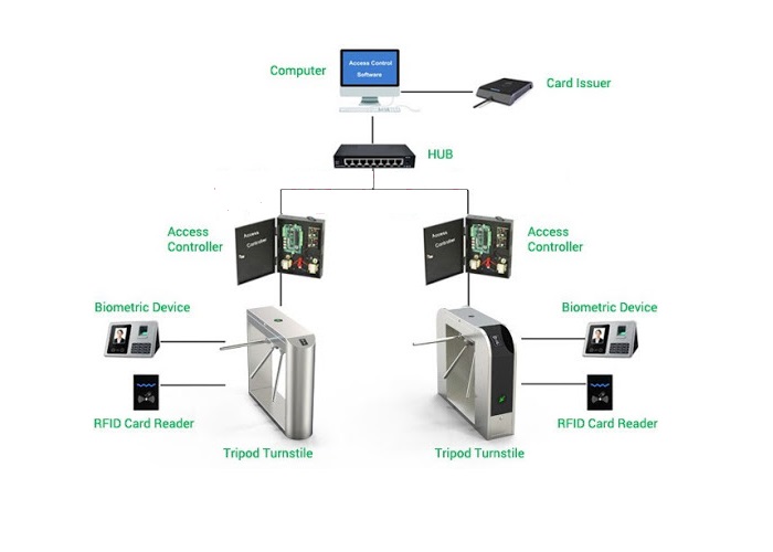 Bộ điều khiển trung tâm: đóng vai trò điều khiển các đầu đọc trên các cổng xoay an ninh, tiếp nhận dữ liệu sử lý thông tin và lưu giữ và gửi tín hiệu điều khiển đến cánh mở