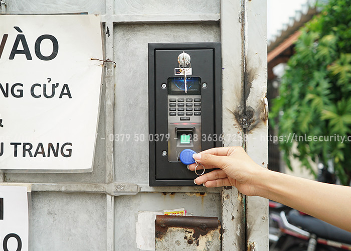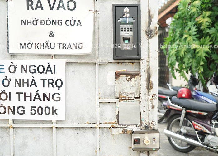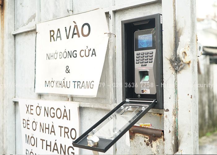 Ngoài ra để đảm bảo an toàn cũng như tránh yếu tố thời tiết bởi đây là cổng ngoài trời không mái che nên chủ trọ đã sử dụng thêm hộp bảo vệ đầu đọc vân tay.