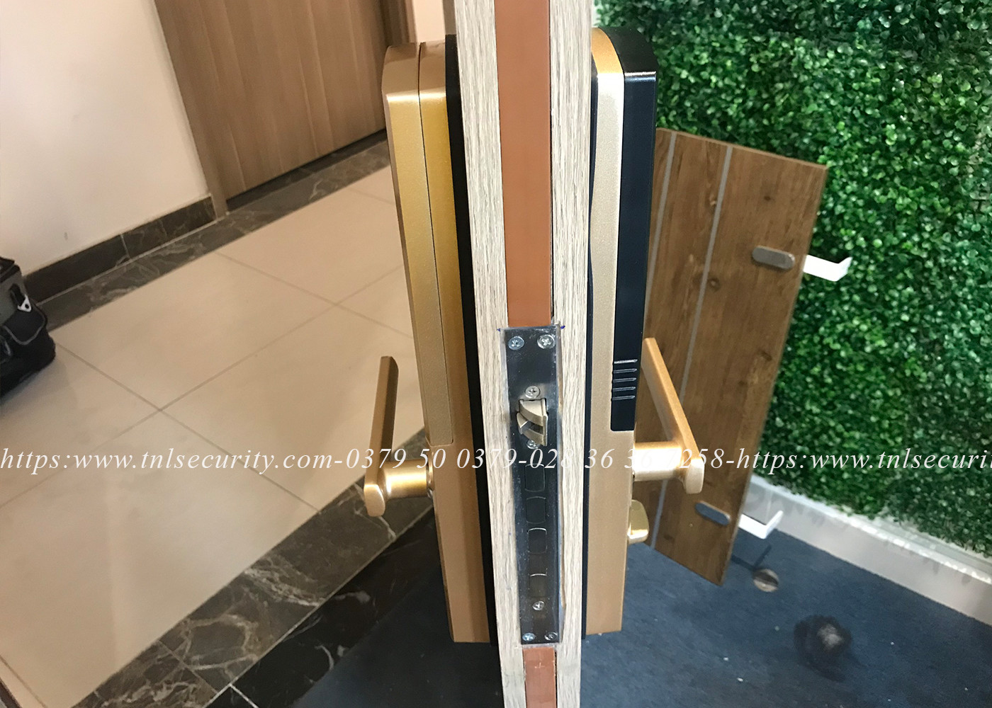 Hình ảnh là bộ khóa phòng vân tay đầu tiên được lắp đặt với cánh tay cầm khung nhôm màu vàng sang trọng thẩm mỹ. Mẫu khóa phòng này với bản trượt để sử dụng vân tay, bàn phím và thẻ từ an toàn không để lộ ra bên ngoài tránh chọc phá.