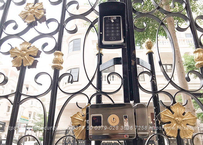 Khóa đầu đọc thẻ từ được nhân viên kỹ thuật lắp trực tiếp trên cánh cửa cổng, mọi đường dây điện được đi âm để tránh kẻ gian phá hoại và cũng trông thẩm mỹ hơn.