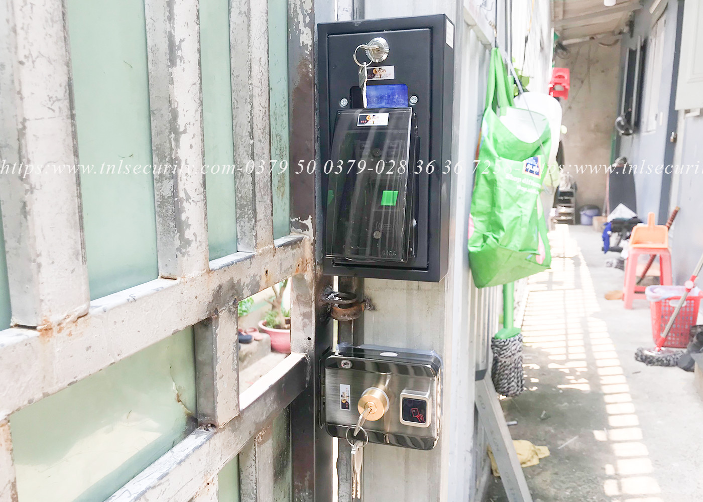 Cuối cùng là hình ảnh bộ khóa cổng vân tay báo động được hoàn thành, trông chúng phù hợp với loại của lùa nhà anh Kiệt. Các thiết bị đều được đặt bên trong và riêng đầu đọc vân tay sẽ được gắn thêm hộp box bảo vệ và miếng che đầu đọc để tránh tình trạng mưa tạt vào gây hư hại.