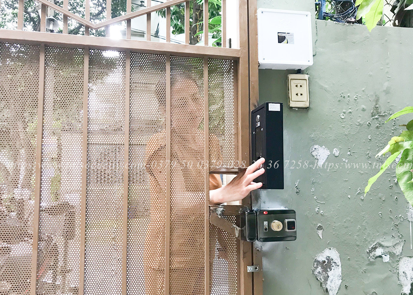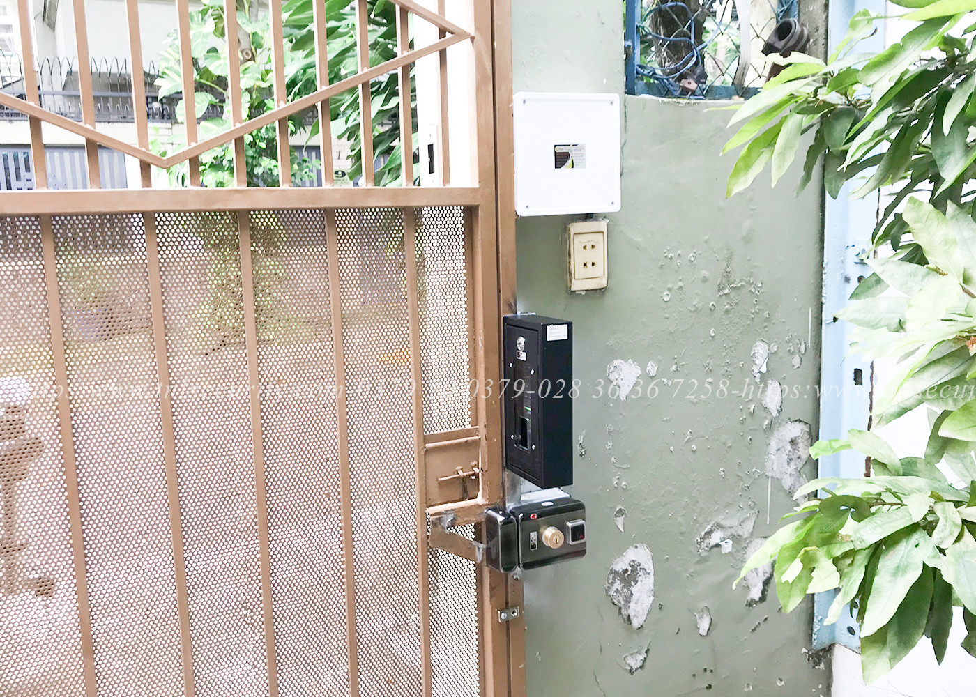 Khóa cổng vân tay được lắp trên cánh cửa sắt một cánh như hình có thể thấy hệ thống hoàn toàn được đặt bên trong tránh dòm ngó từ bên ngoài. Thiết bị đầu đọc được bảo vệ an toàn tránh nắng mưa khi có hộp riêng biệt, người dùng sử dụng vân tay hai chiều khi cửa có lỗ thò tay phù hợp cho chi phí dùng ít người.
