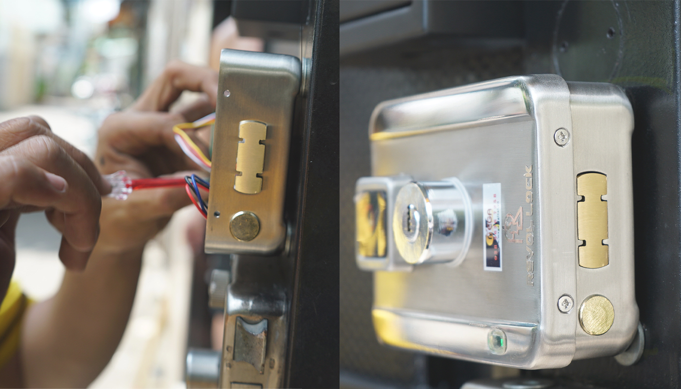 Đầu tiên kỹ thuật cần phải khảo sát cửa trước khi lắp, xác định vị trí lắp khóa, xử lý phần dư của cửa và cắt hàn tại vị ví lắp nếu cần thiết. Sau đó kỹ thuật tiến hành cắt lỗ thò tay, dùng để luồng tay từ ngoài vào trong để mở khóa bằng vân tay, thẻ từ, chìa cơ.