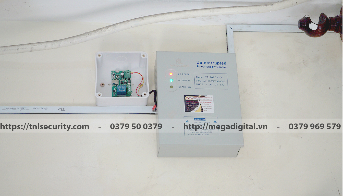 Cuối cùng, bộ nguồn chuyên dụng 12V-5A được lắp trên cao, an toàn cho người sử dụng và bên trong là nguồn lưu điện khi cúp điện khóa vẫn sử dụng được (khoảng từ 4-8 tiếng tùy mức độ sử dụng). Bộ điều khiển mở khóa từ xa qua app cùng được lắp trên cao cạnh bộ nguồn, thiết bị này dùng để mở khóa từ xa khi chủ không có nhà vẫn có thể mở khóa được.