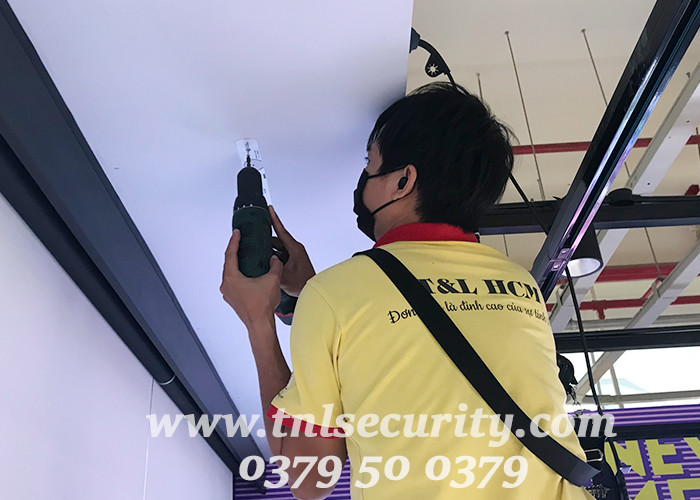 Tiếp theo là tiến hành khoan để cố định máy đếm người sao cho chắc chắn và lấy khoảng cách để đếm người tốt nhất.