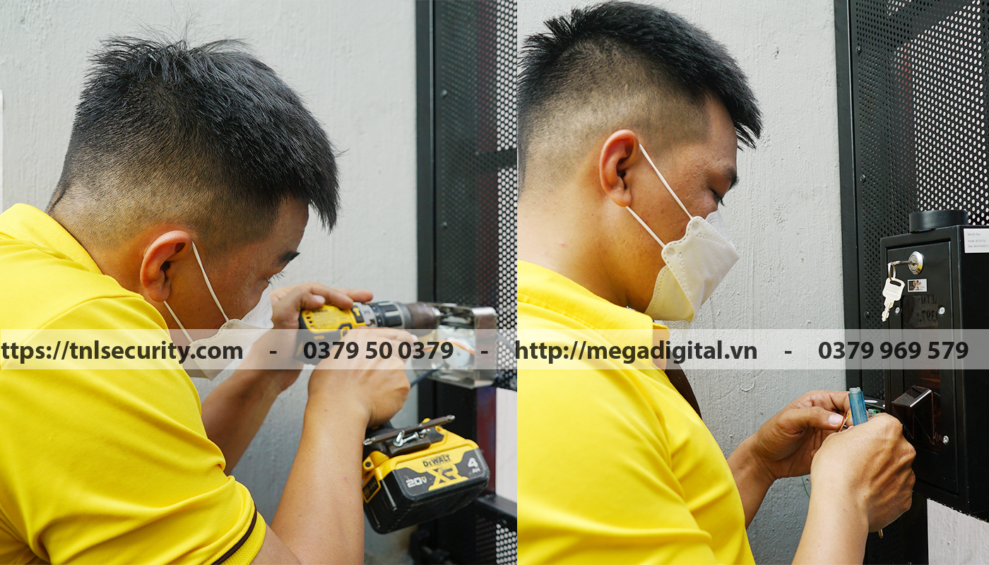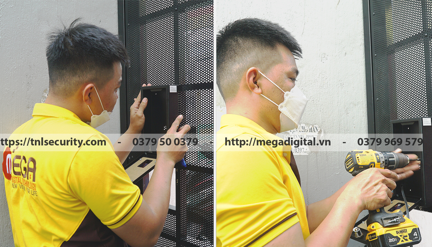 Bước tiếp theo, kỹ thuật viên sẽ lắp khóa điện tử cố định lên cửa và khóa vân tay được lắp vào bên trong hộp bảo vệ nắng mưa nhằm đảm bảo độ bền của thiết bị.