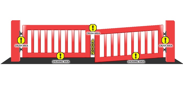 Thiết bị tự động hóa và các phụ kiện khác như thiết bị an toàn, khóa và hệ thống kiểm soát ra vào cùng nhau sẽ tạo ra một ‘cỗ máy’ mới từ những yếu tố này, máy mới này cần phải an toàn nhất có thể. Đối với hầu hết các hệ thống cửa là cổng xoay hoặc trượt đóng mở. Điều này tạo ra một số rủi ro tiềm ẩn, những rủi ro này dựa trên cách mỗi cổng di chuyển trong mối quan hệ với trụ cổng, các lá cổng khác, hàng rào, tường và lan can. Trước khi kết hợp bất kỳ hệ thống cửa tự động nào, cần tiến hành đánh giá an toàn để thử và xác định các rủi ro tiềm ẩn như: