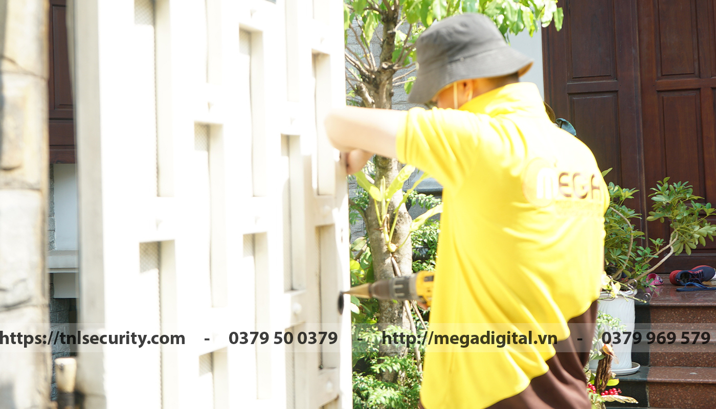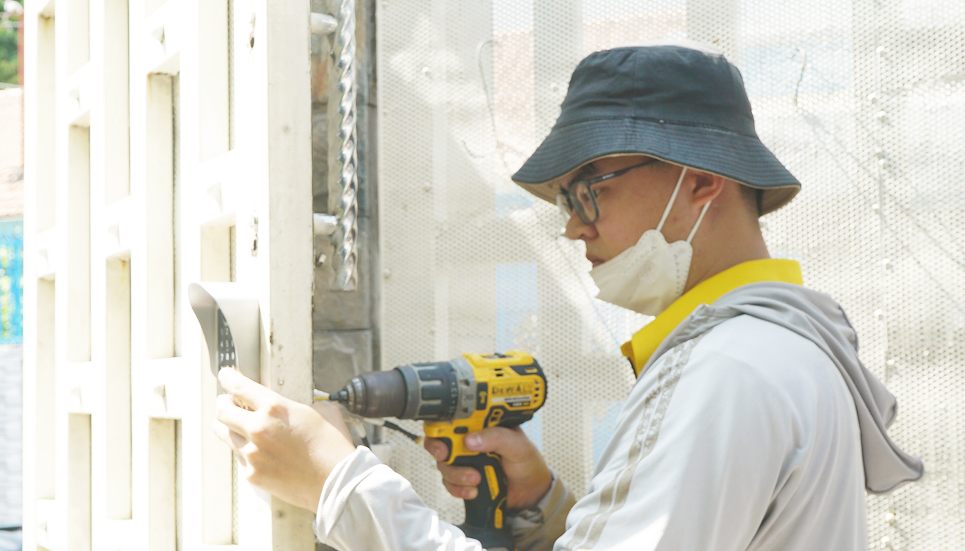Sau khi xử lí vị trí lắp đặt xong, anh kỹ thuật tiến hành lắp cố định bát khóa.