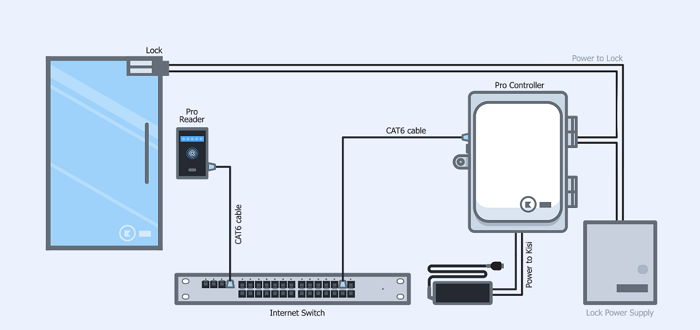 Trong sơ đồ này, bạn có thể thấy cách đấu dây cơ bản cho hệ thống kiểm soát ra vào bằng khóa điện. Cái trong sơ đồ là một khóa từ, nhưng tiền đề là giống nhau cho một cuộc tấn công điện. Người đọc nhận thông tin xác thực truy cập, gửi chúng đến bộ điều khiển để xác thực và nếu chúng được chấp thuận, bộ điều khiển sẽ ra lệnh cho nguồn điện cung cấp hoặc ngắt nguồn điện cho khóa mở cửa.