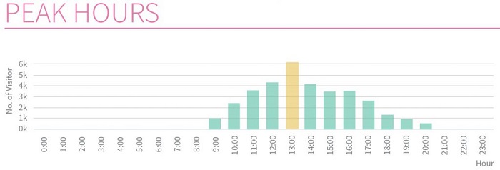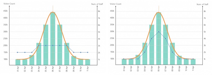 Điều chỉnh và tối ưu hóa giờ làm việc của nhân viên dựa trên số lượng khách truy cập của cửa hàng thông qua máy đếm người. Trong hình minh họa ở trên, có số lượng khách truy cập đặc biệt cao trong 13:00, điều này có nghĩa là nhân viên không nên đi nghỉ trưa trong giờ này để phục vụ lưu lượng truy cập tăng. Quản lý cấp trên có thể phân bổ nhân viên cho các cửa hàng của họ dựa trên xu hướng lịch sử và mức độ giảm thiểu tác động của khách hàng để có thể phân bổ nguồn lực không hiệu quả thành hiệu quả.