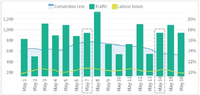 Việc lắp đặt máy đếm người tại cửa hàng có thể giúp tối ưu hóa việc phân bổ nhân sự để bảo tồn nguồn nhân lực và nó không có nghĩa là giảm số lượng nhân viên mà phân bổ nhân viên vào những khung giờ có khách hàng đông đúc để đảm bảo việc quản lý cửa hàng. Trong hình minh họa, doanh thu kiếm được từ ngày 1 cao hơn đáng kể so với ngày 2 với cùng số lượng lưu lượng truy cập mặc dù có nhiều giờ nhân viên hơn. Điều này đặt ra câu hỏi cho các nhà bán lẻ để xác định sẽ phân bổ thêm nhân viên có tác động tích cực đến chuyển đổi thành chi phí.