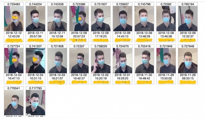 LinkSprite nhận dạng khuôn mặt thông qua camera an ninh thông minh AI chụp tất cả các khuôn mặt trong trường nhìn và thực hiện phân cụm tất cả các khuôn mặt để đếm cùng một người chỉ một lần. Giống như trong hình dưới đây, cùng một người đi vào cửa hàng nhiều lần trong một ngày và không đeo khẩu trang.