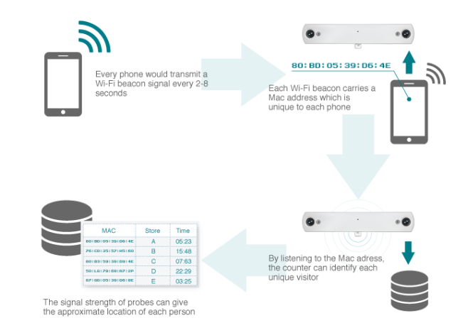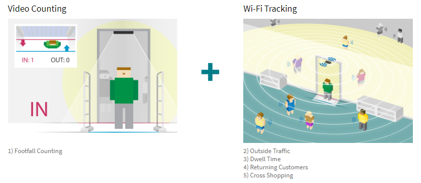 Công nghệ Video Couting được sử dụng để đếm số lượng người tuyệt đối vào và ra khỏi cửa hàng. Trong khi công nghệ Wi-Fi-Tracking cho phép thu thập dữ liệu Wi-Fi như địa chỉ MAC ID duy nhất từ các thiết bị thông minh mà mọi người mang theo và cung cấp phân tích wi-fi chuyên sâu như phân tích vùng, thời gian dừng, người qua đường, tốc độ, lưu lượng truy cập, khách hàng trở lại và mua sắm chéo.